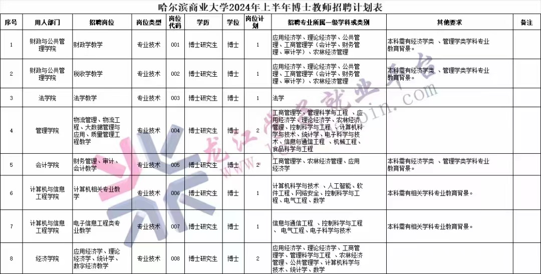 (八)各崗位的數(shù)量、專業(yè)及具體要求,詳見《哈爾濱商業(yè)大學2024年上半年博士教師招聘計劃表》(附件1)。